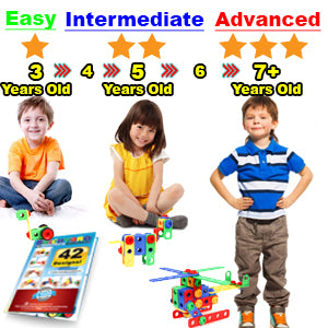 Construction Engineering Building Blocks include a large, full-color guide with 42 designs your kids can build, starting from easy for 3 year olds to intermediate for 4-5 year olds to advanced for ages 6 and over.
